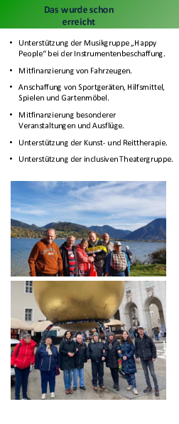 - Werben für ein besseres Verständnis der Öffentlichkeit gegenüber den besonderen Bedürfnissen der Menschen, die in der Samariterstiftung in Neresheim leben.