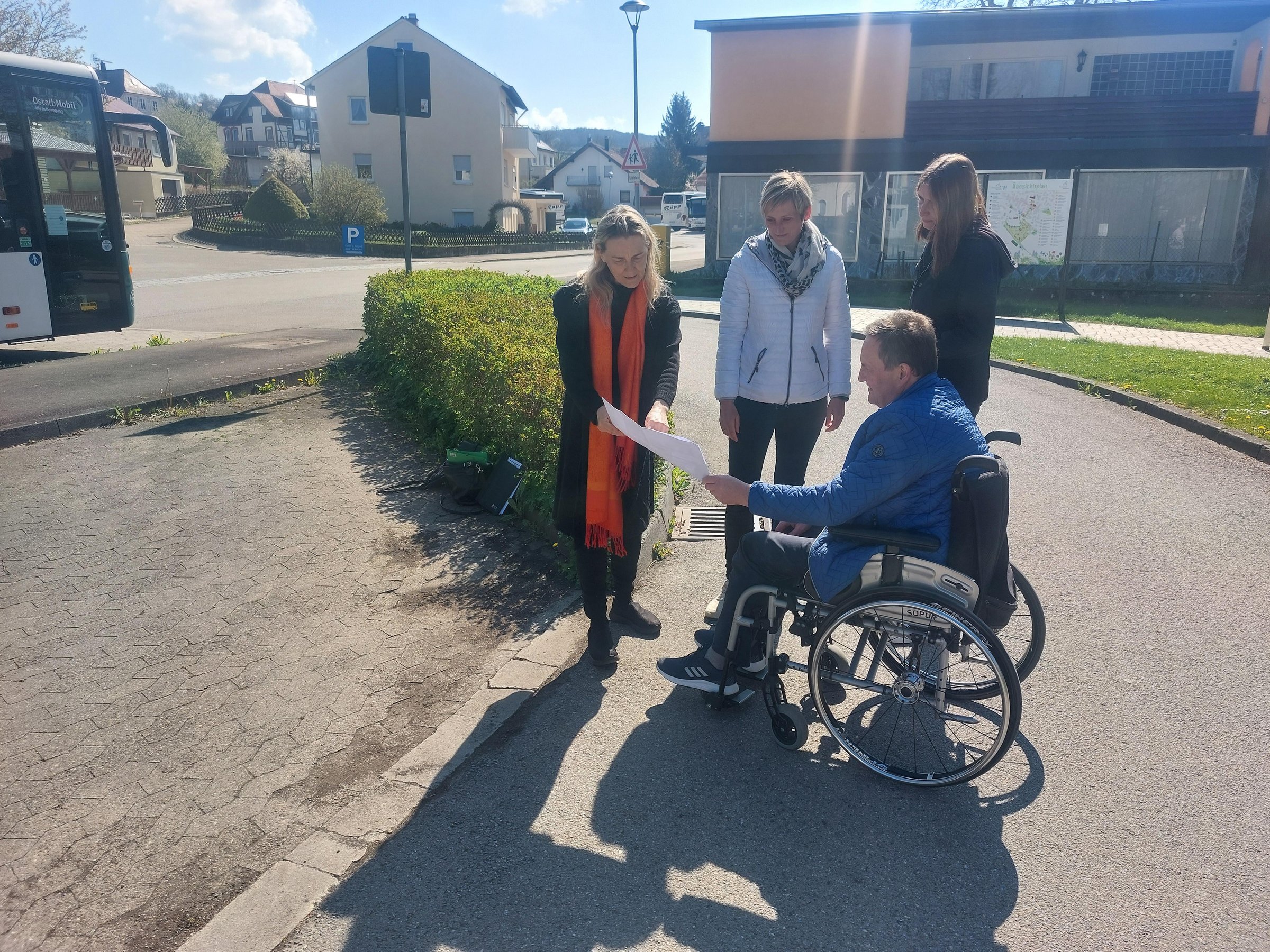 Baumamtsleiterin Eva Ramsperger, Petra Pachner, Matthias Balle, der als externer Berater die Stadt aus Sicht eines Rollstuhlfahrer berät, und Frau Jasmin Albert, zuständig bei der Stadt für Inklusion, nahmen bei der gemeinsamen Begehung am 28.04.2022 die Bushaltestellen in Elchingen und die Behindertenparkplätze in Neresheim in den Blick.