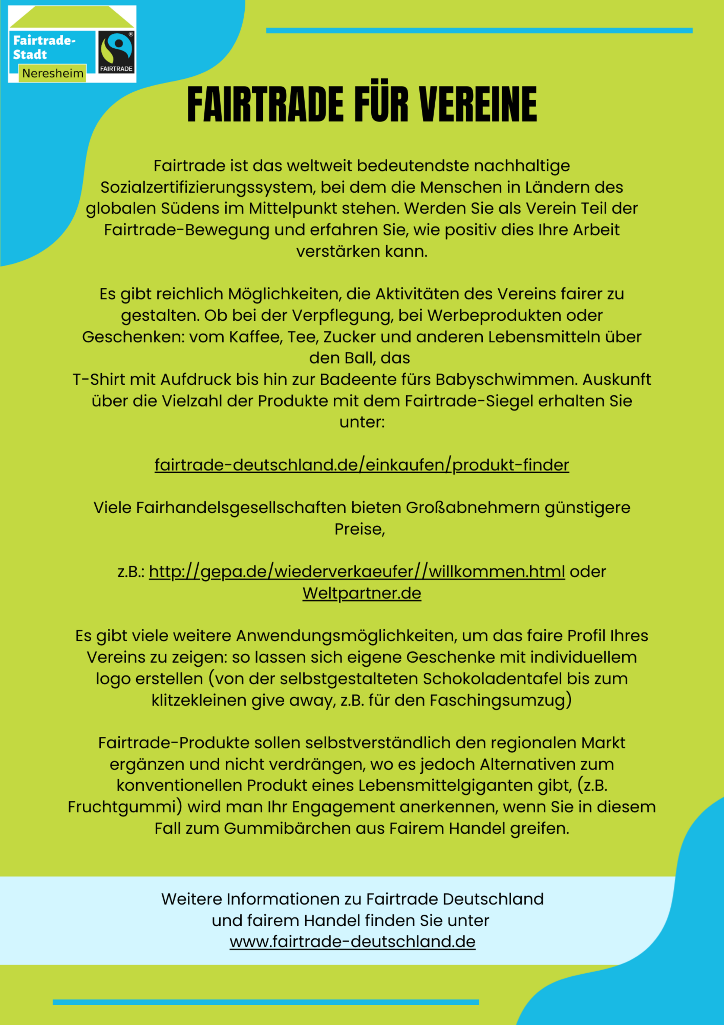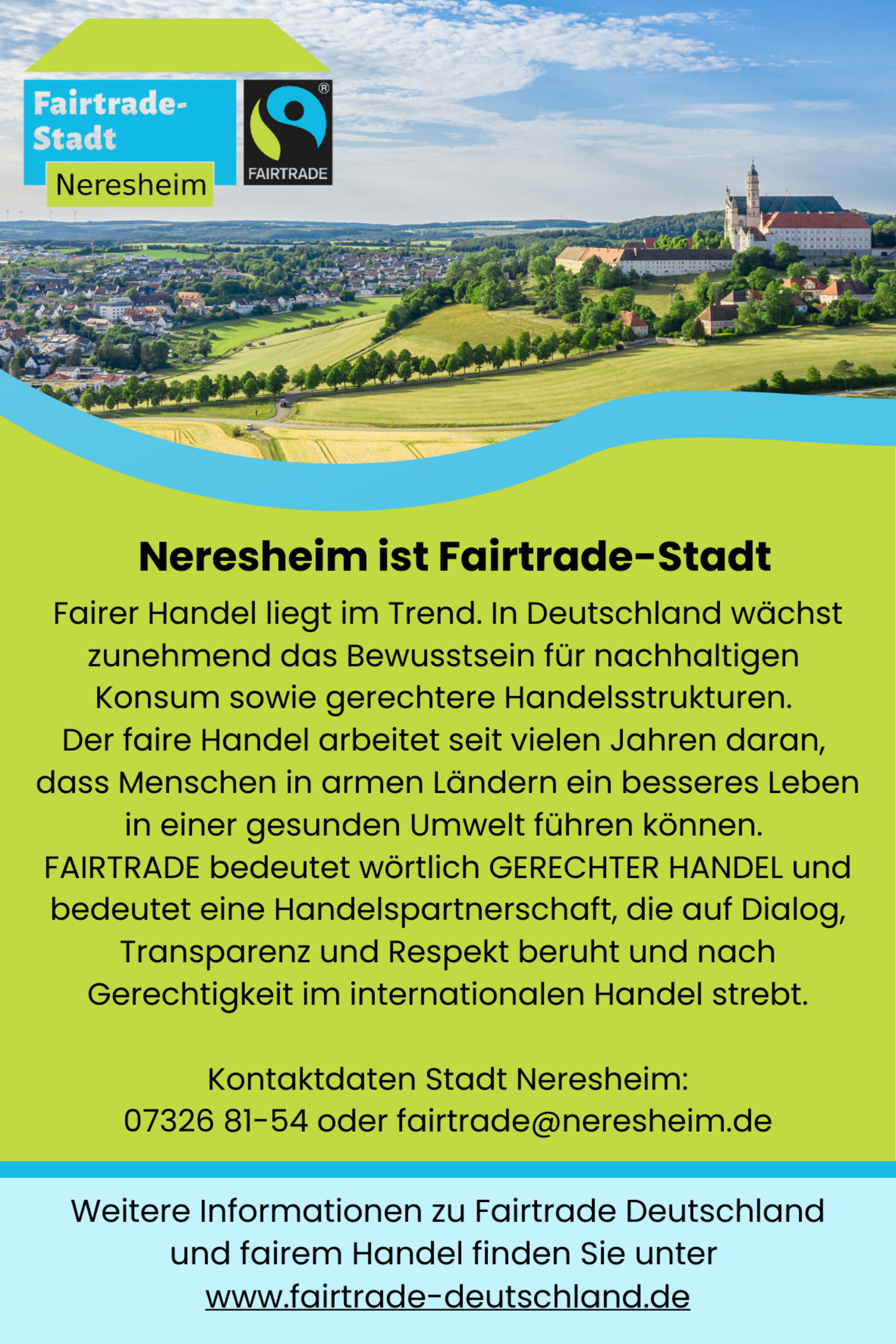 Nach einer mehrmonatigen Bewerbungsphase wurde die Bewerbung der Stadt Neresheim zur Fairtrade-Stadt durch das oberste Prüfgremium von Fairtrade Deutschland e.V. erfolgreich bestätigt.